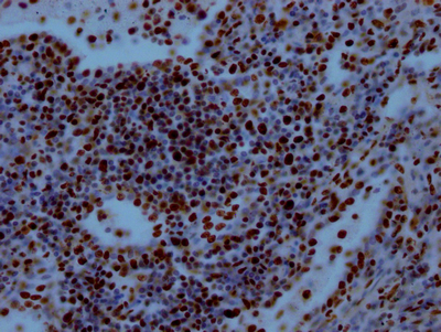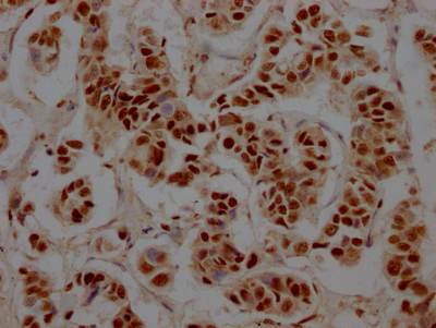 IHC image of CSB-RA915915A0HU diluted at 1:100 and staining in paraffin-embedded human breast cancer performed on a Leica BondTM system. After dewaxing and hydration, antigen retrieval was mediated by high pressure in a citrate buffer (pH 6.0). Section was blocked with 10% normal goat serum 30min at RT. Then primary antibody (1% BSA) was incubated at 4℃ overnight. The primary is detected by a Goat anti-rabbit IgG polymer labeled by HRP and visualized using 0.05% DAB.