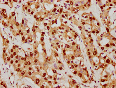 IHC image of CSB-RA022948A0HU diluted at 1:92.5 and staining in paraffin-embedded human liver cancer performed on a Leica BondTM system. After dewaxing and hydration, antigen retrieval was mediated by high pressure in a citrate buffer (pH 6.0). Section was blocked with 10% normal goat serum 30min at RT. Then primary antibody (1% BSA) was incubated at 4℃ overnight. The primary is detected by a biotinylated secondary antibody and visualized using an HRP conjugated SP system.
