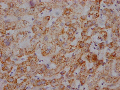 IHC image of CSB-RA229127A0HU diluted at 1:100 and staining in paraffin-embedded human liver tissue performed on a Leica BondTM system. After dewaxing and hydration, antigen retrieval was mediated by high pressure in a citrate buffer (pH 6.0). Section was blocked with 10% normal goat serum 30min at RT. Then primary antibody (1% BSA) was incubated at 4℃ overnight. The primary is detected by a Goat anti-rabbit IgG polymer labeled by HRP and visualized using 0.05% DAB.
