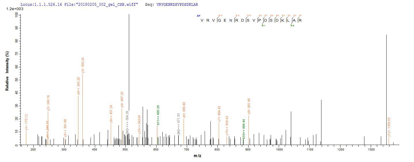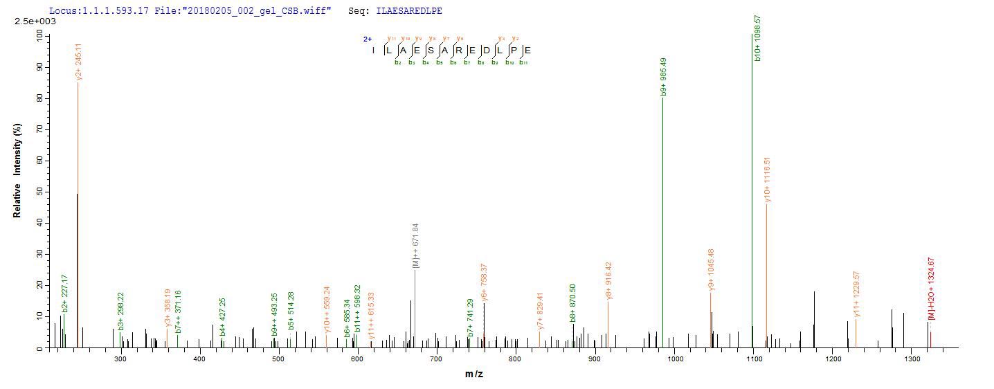 Based on the SEQUEST from database of Yeast host and target protein, the LC-MS/MS Analysis result of CSB-YP873303DOA could indicate that this peptide derived from Yeast-expressed Arabidopsis thaliana (Mouse-ear cress) UGT89C1.
