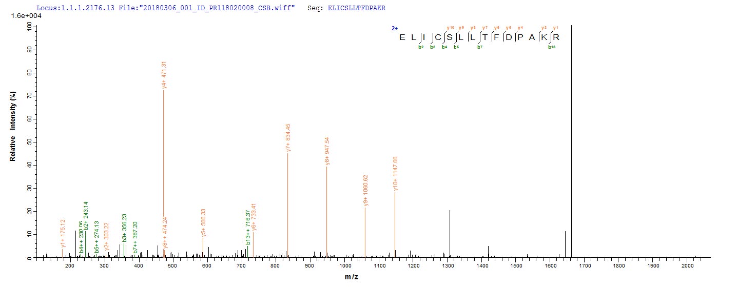 Based on the SEQUEST from database of E.coli host and target protein, the LC-MS/MS Analysis result of CSB-EP738902CZI could indicate that this peptide derived from E.coli-expressed Candida glabrata (strain ATCC 2001 / CBS 138 / JCM 3761 / NBRC 0622 / NRRL Y-65) (Yeast) (Torulopsis glabrata) ATG1.