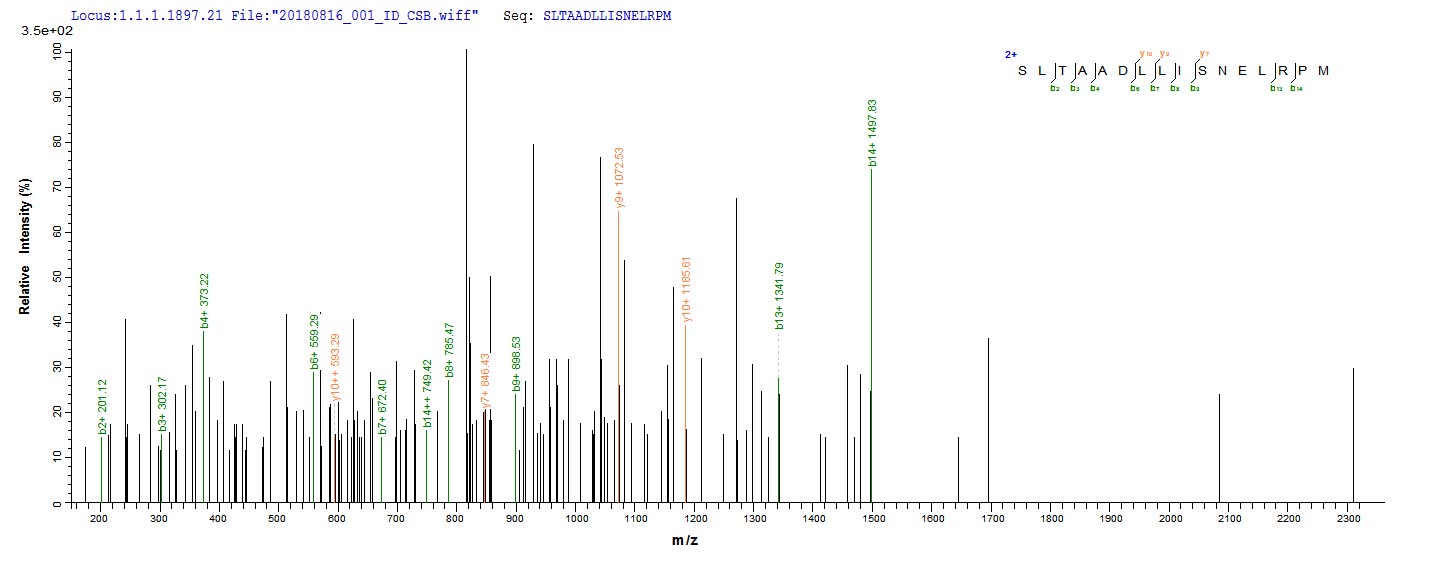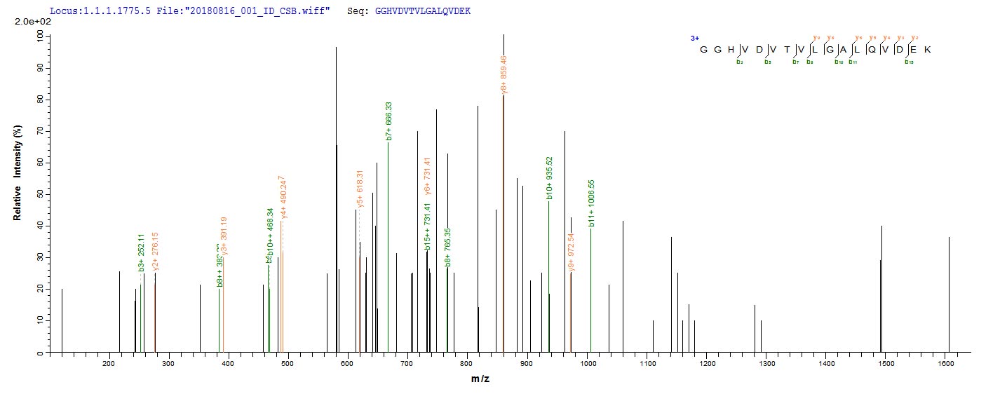 Based on the SEQUEST from database of E.coli host and target protein, the LC-MS/MS Analysis result of CSB-EP332931DUB could indicate that this peptide derived from E.coli-expressed Clostridium acetobutylicum (strain ATCC 824 / DSM 792 / JCM 1419 / LMG 5710 / VKM B-1787) ctfB.