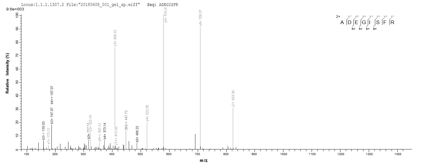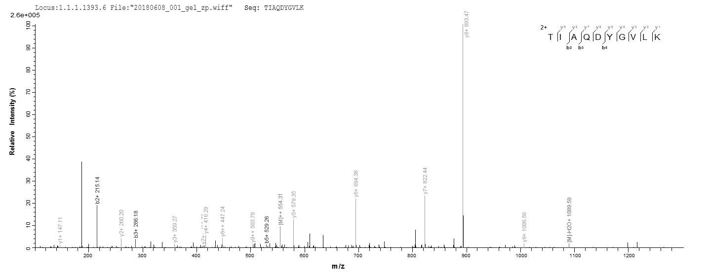 Based on the SEQUEST from database of E.coli host and target protein, the LC-MS/MS Analysis result of CSB-EP872876DXU could indicate that this peptide derived from E.coli-expressed Cricetulus griseus (Chinese hamster) (Cricetulus barabensis griseus) PRDX1.