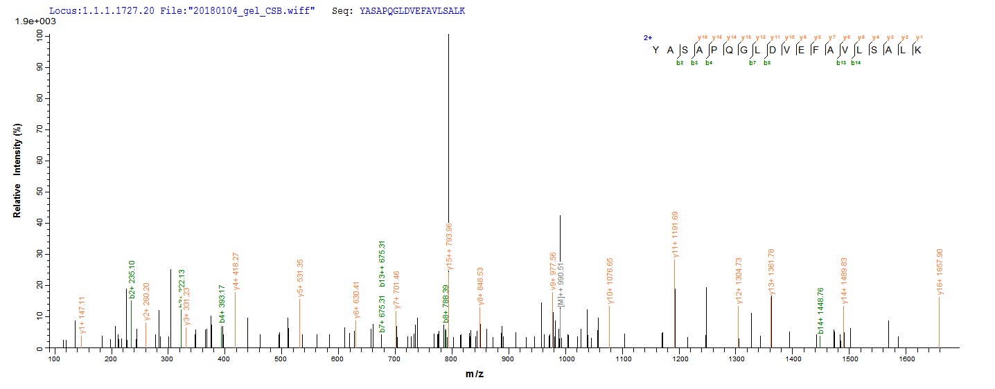 Based on the SEQUEST from database of E.coli host and target protein, the LC-MS/MS Analysis result of CSB-EP355978EFA could indicate that this peptide derived from E.coli-expressed Epstein-Barr virus (strain B95-8) (HHV-4) (Human herpesvirus 4) BALF5.