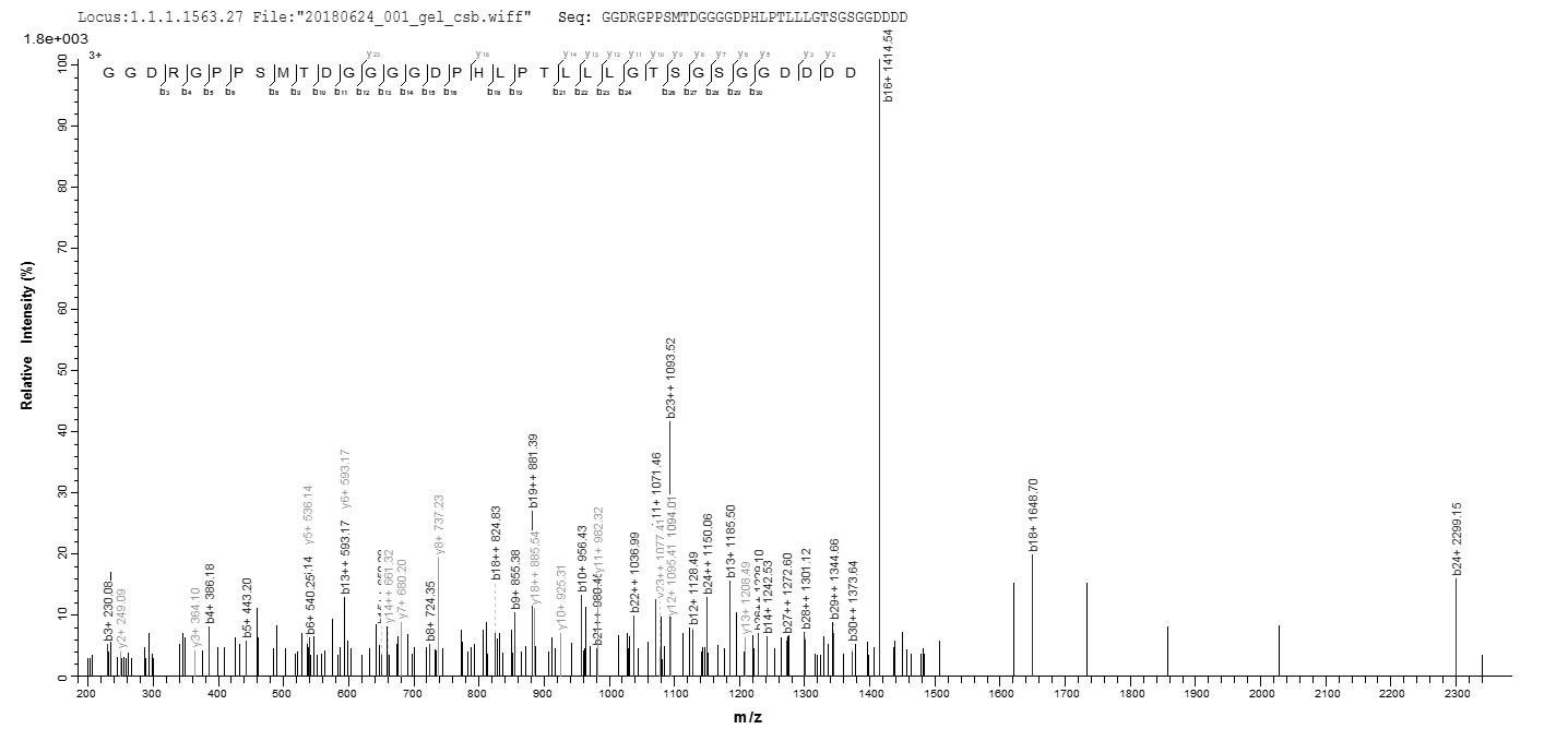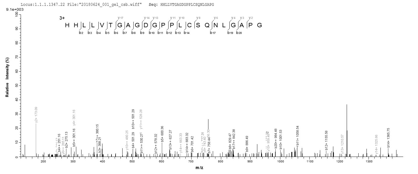 Based on the SEQUEST from database of E.coli host and target protein, the LC-MS/MS Analysis result of CSB-EP624920EEZ1 could indicate that this peptide derived from E.coli-expressed Epstein-Barr virus (strain AG876) (HHV-4) (Human herpesvirus 4) LMP1.