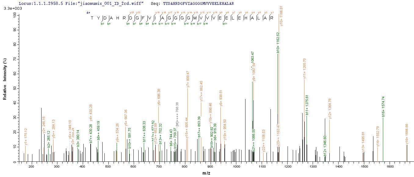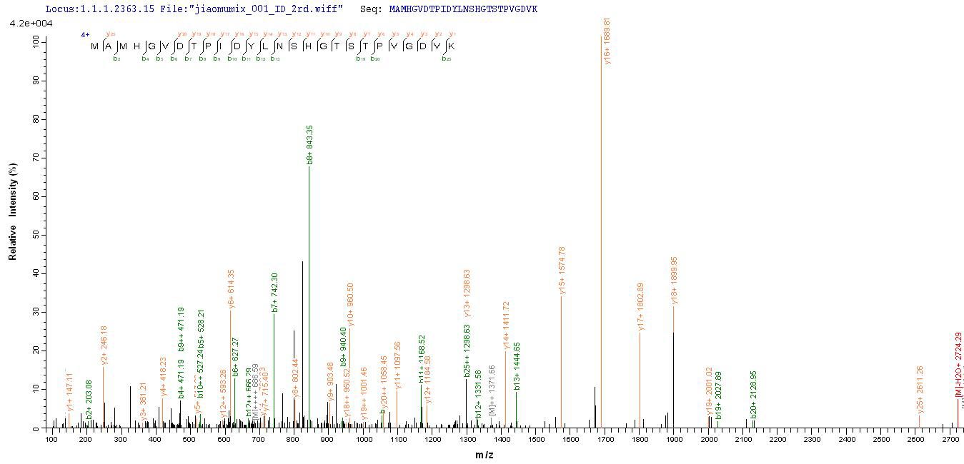 Based on the SEQUEST from database of E.coli host and target protein, the LC-MS/MS Analysis result of CSB-EP359247ENVa3 could indicate that this peptide derived from E.coli-expressed Escherichia coli (strain K12) fabB.