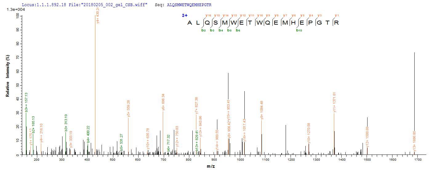 Based on the SEQUEST from database of E.coli host and target protein, the LC-MS/MS Analysis result of CSB-RP145074Ba could indicate that this peptide derived from E.coli-expressed Escherichia coli (strain K12) speA.