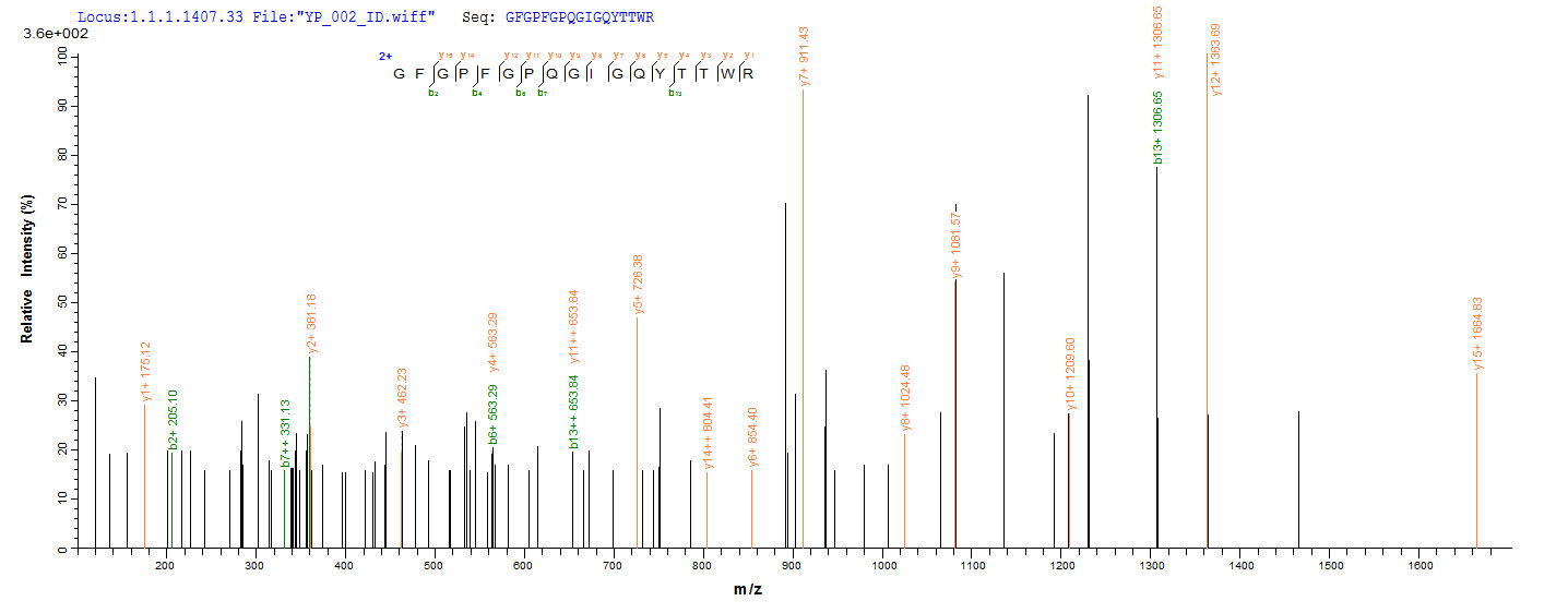Based on the SEQUEST from database of Yeast host and target protein, the LC-MS/MS Analysis result of CSB-YP365448ENL could indicate that this peptide derived from Yeast-expressed Escherichia coli hph.