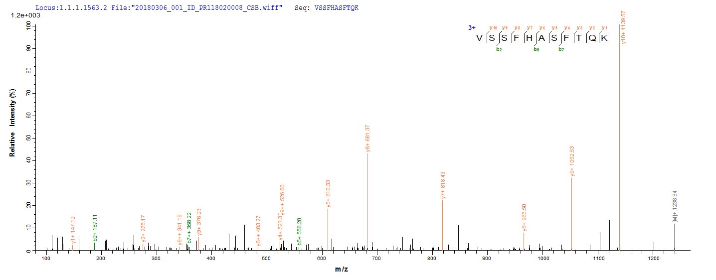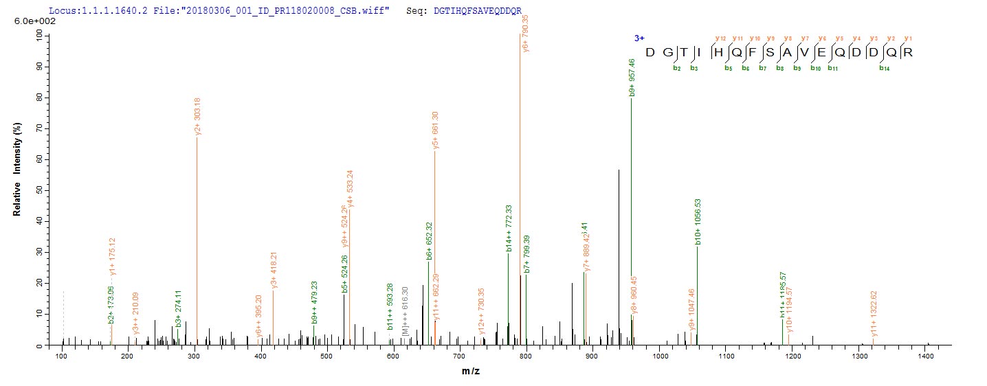 Based on the SEQUEST from database of Yeast host and target protein, the LC-MS/MS Analysis result of CSB-YP419575EJF could indicate that this peptide derived from Yeast-expressed Escherichia coli O9:H4 (strain HS) lolA.