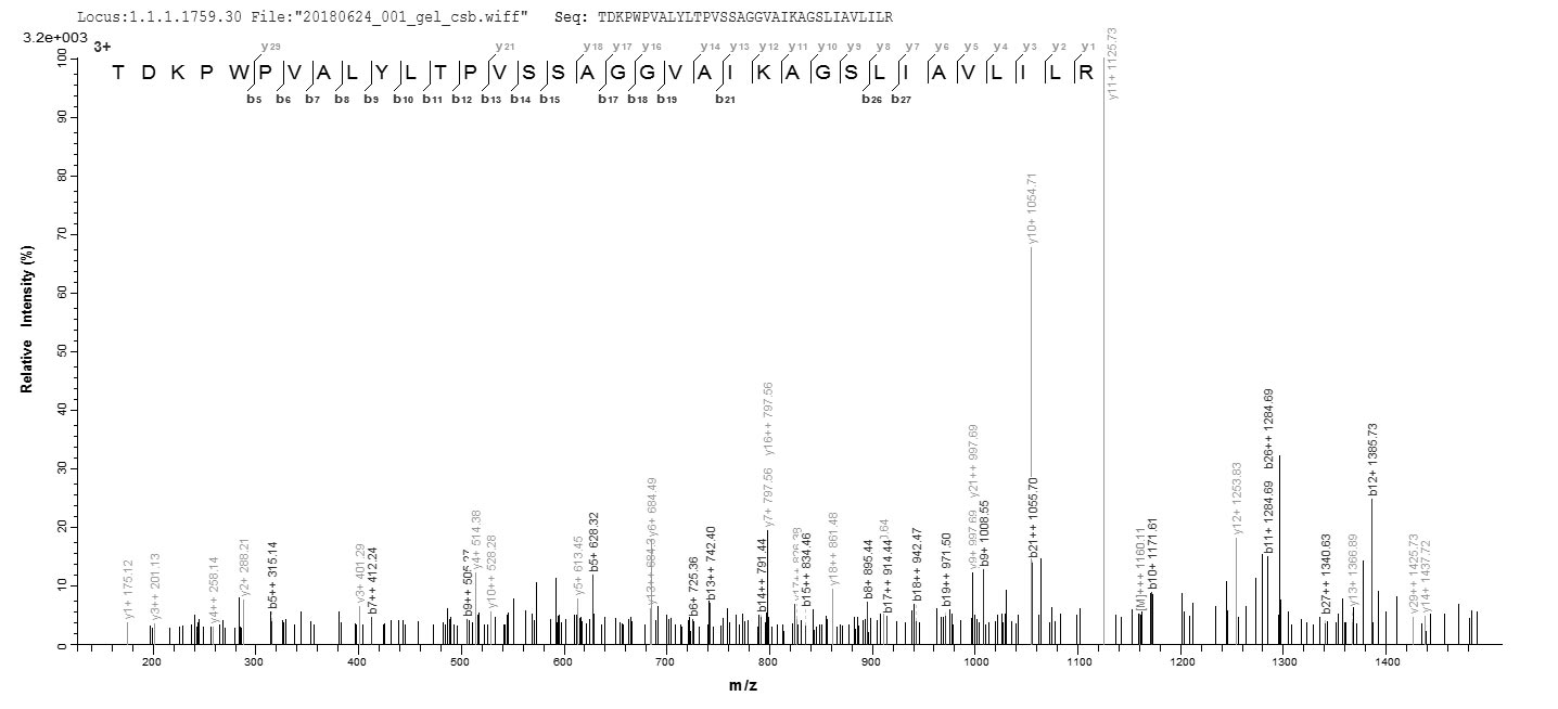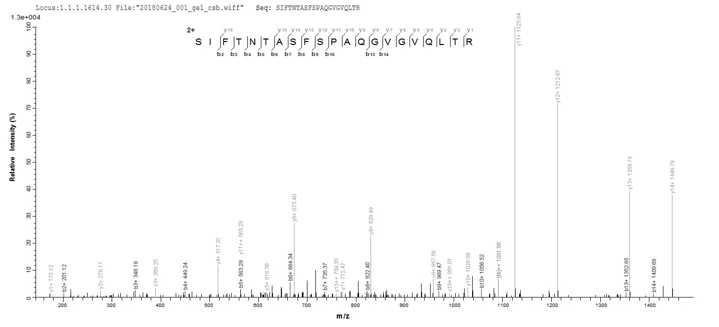 Based on the SEQUEST from database of E.coli host and target protein, the LC-MS/MS Analysis result of CSB-EP362349ENVa0 could indicate that this peptide derived from E.coli-expressed Escherichia coli (strain K12) fimH.
