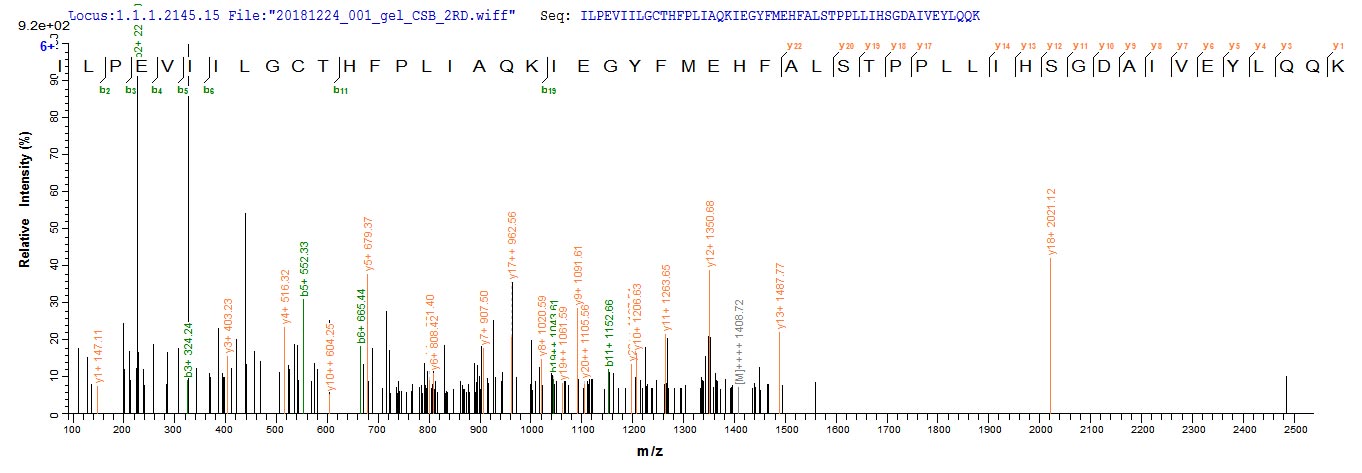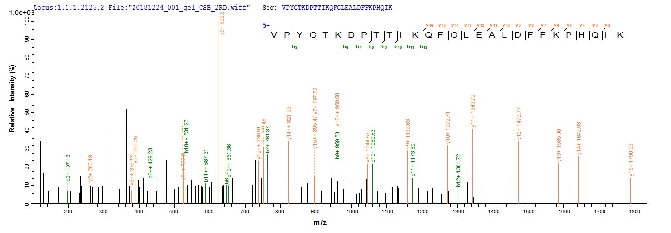 Based on the SEQUEST from database of E.coli host and target protein, the LC-MS/MS Analysis result of CSB-EP475624HUX could indicate that this peptide derived from E.coli-expressed Helicobacter pylori (strain G27) murI.