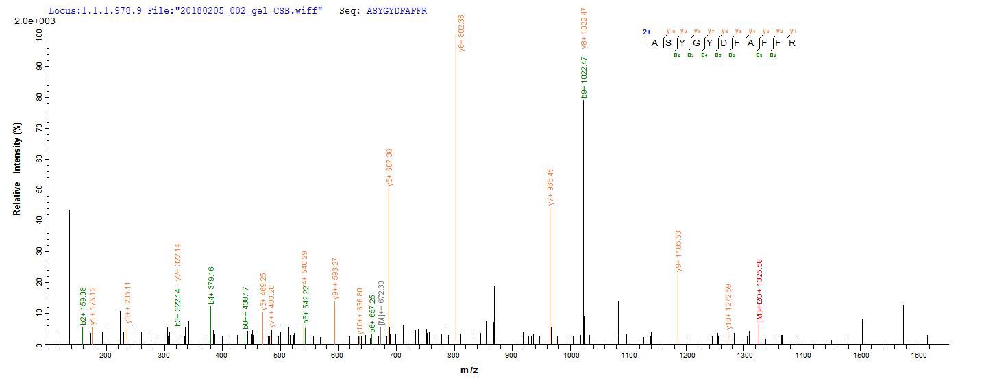 Based on the SEQUEST from database of E.coli host and target protein, the LC-MS/MS Analysis result of CSB-EP345927HUV could indicate that this peptide derived from E.coli-expressed Helicobacter pylori (strain ATCC 700392 / 26695) (Campylobacter pylori) vacA.
