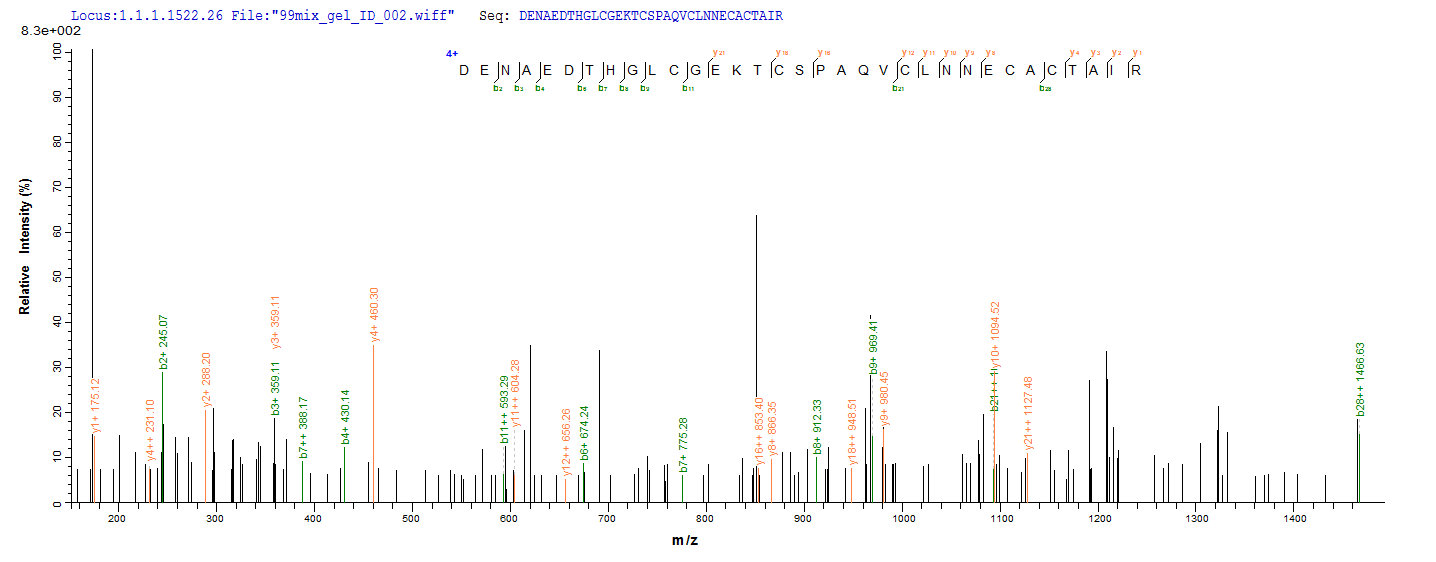 Based on the SEQUEST from database of Yeast host and target protein, the LC-MS/MS Analysis result of CSB-YP342406HHK could indicate that this peptide derived from Yeast-expressed Hirudo nipponia (Korean blood-sucking leech) Guamerin.