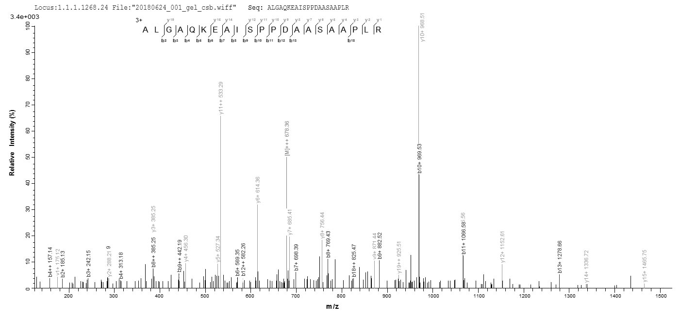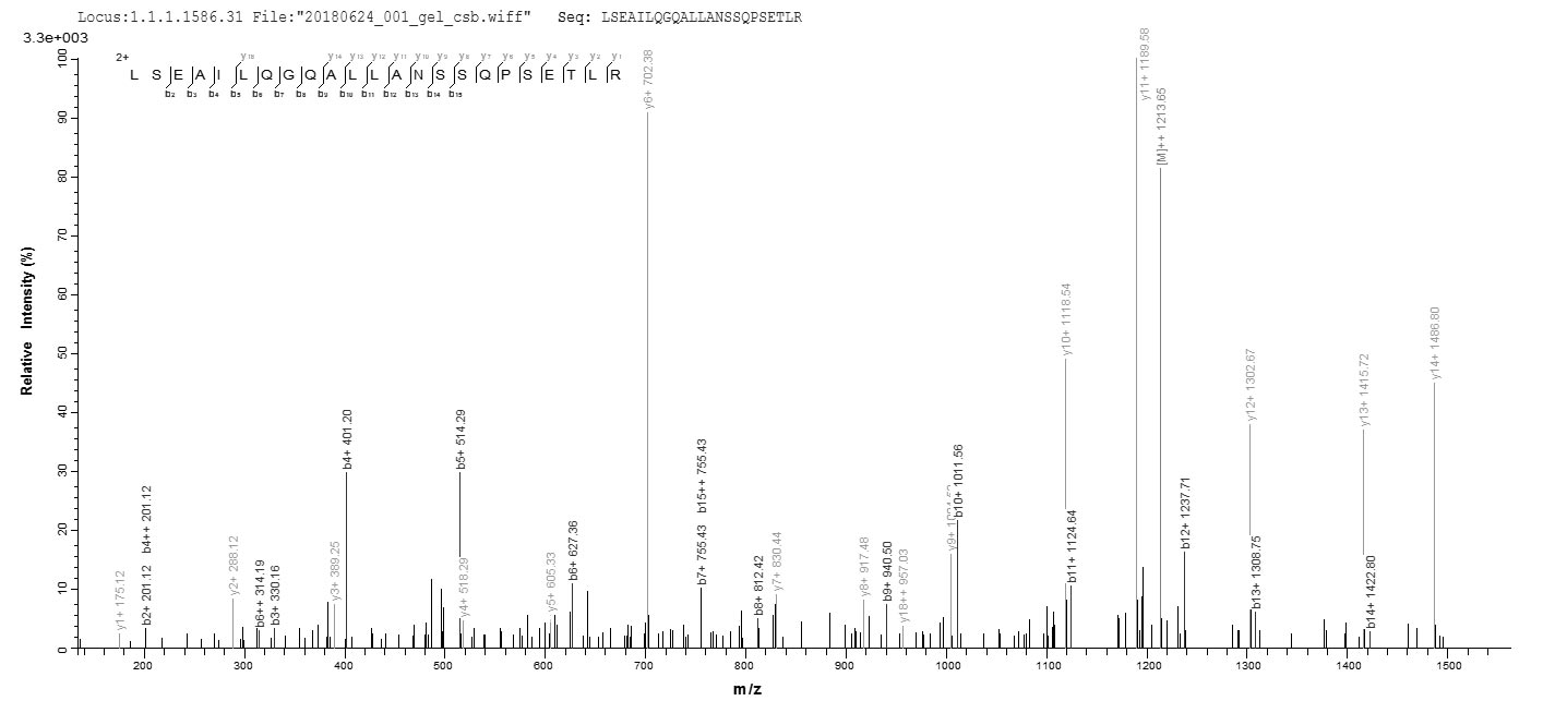 Based on the SEQUEST from database of E.coli host and target protein, the LC-MS/MS Analysis result of CSB-EP007743HO could indicate that this peptide derived from E.coli-expressed Equus caballus (Horse) EPO.
