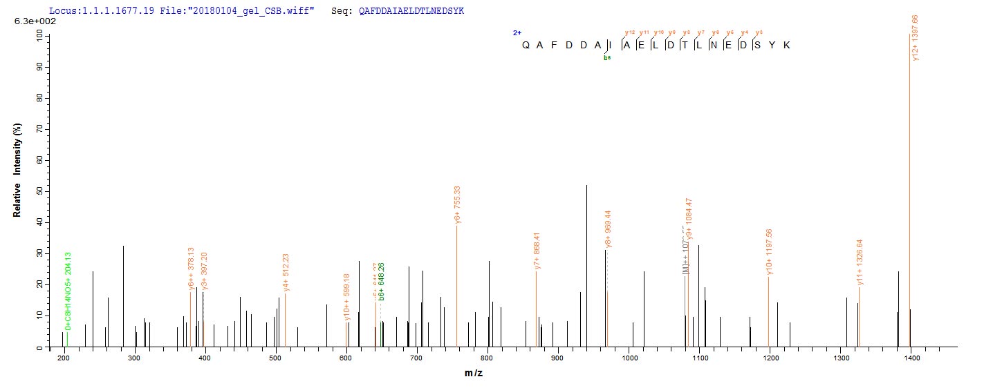 Based on the SEQUEST from database of E.coli host and target protein, the LC-MS/MS Analysis result of CSB-RP021744h could indicate that this peptide derived from E.coli-expressed Homo sapiens (Human) YWHAH.
