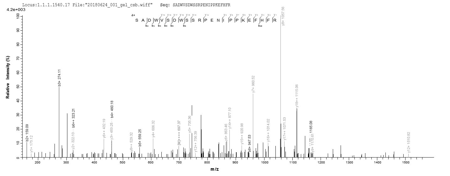 Based on the SEQUEST from database of Yeast host and target protein, the LC-MS/MS Analysis result of CSB-YP002767HU could indicate that this peptide derived from Yeast-expressed Homo sapiens (Human) BNIP3L.