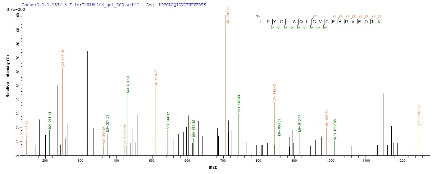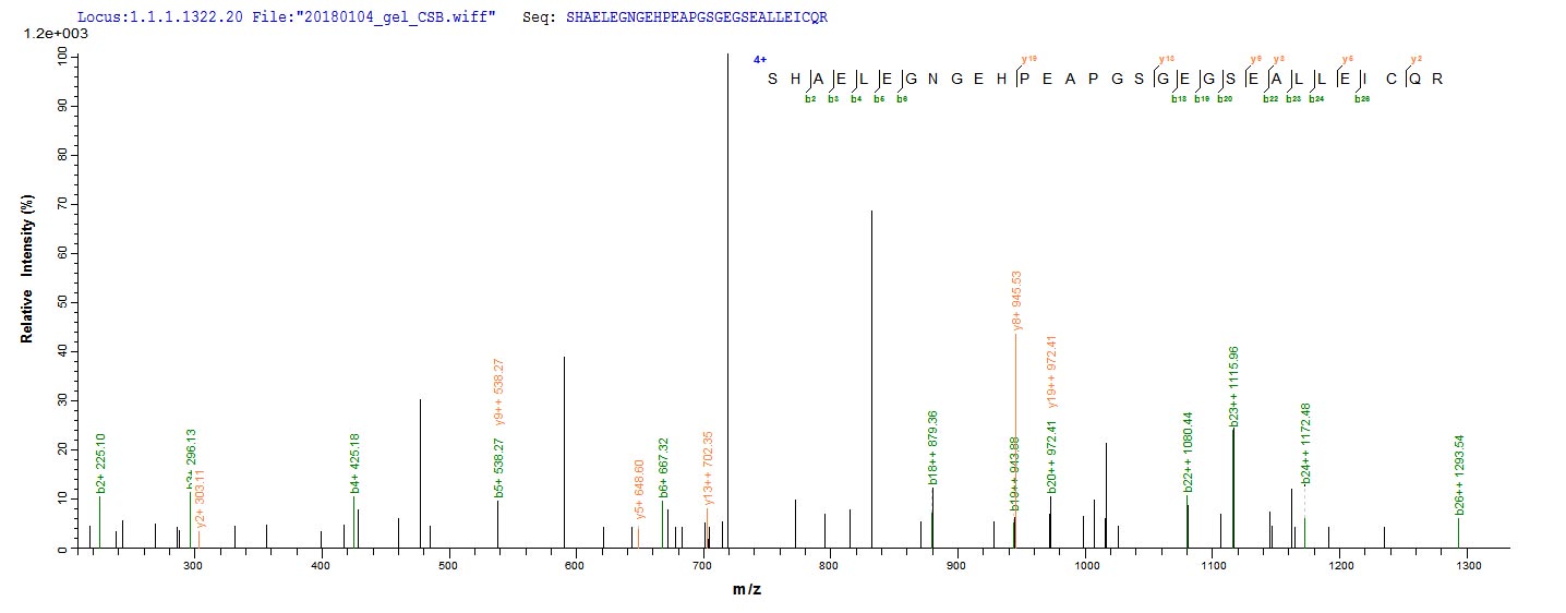 Based on the SEQUEST from database of E.coli host and target protein, the LC-MS/MS Analysis result of CSB-EP883399HU could indicate that this peptide derived from E.coli-expressed Homo sapiens (Human) POLG2.