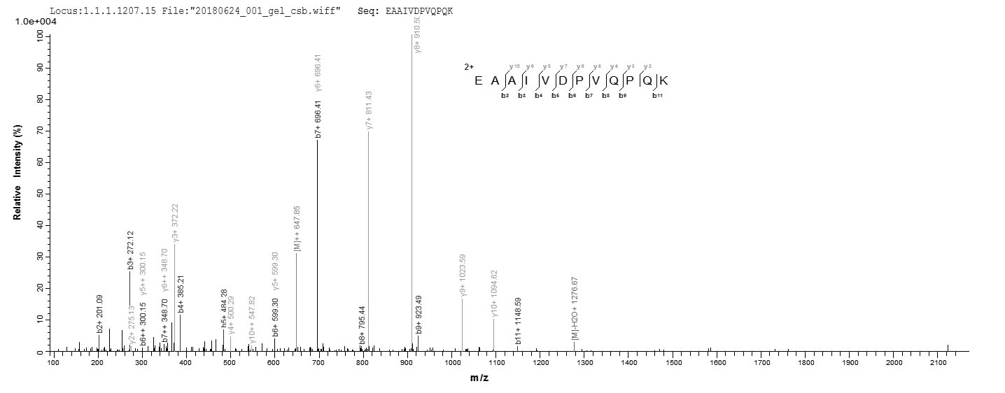 Based on the SEQUEST from database of E.coli host and target protein, the LC-MS/MS Analysis result of CSB-RP111954h could indicate that this peptide derived from E.coli-expressed Homo sapiens (Human) HAGH.