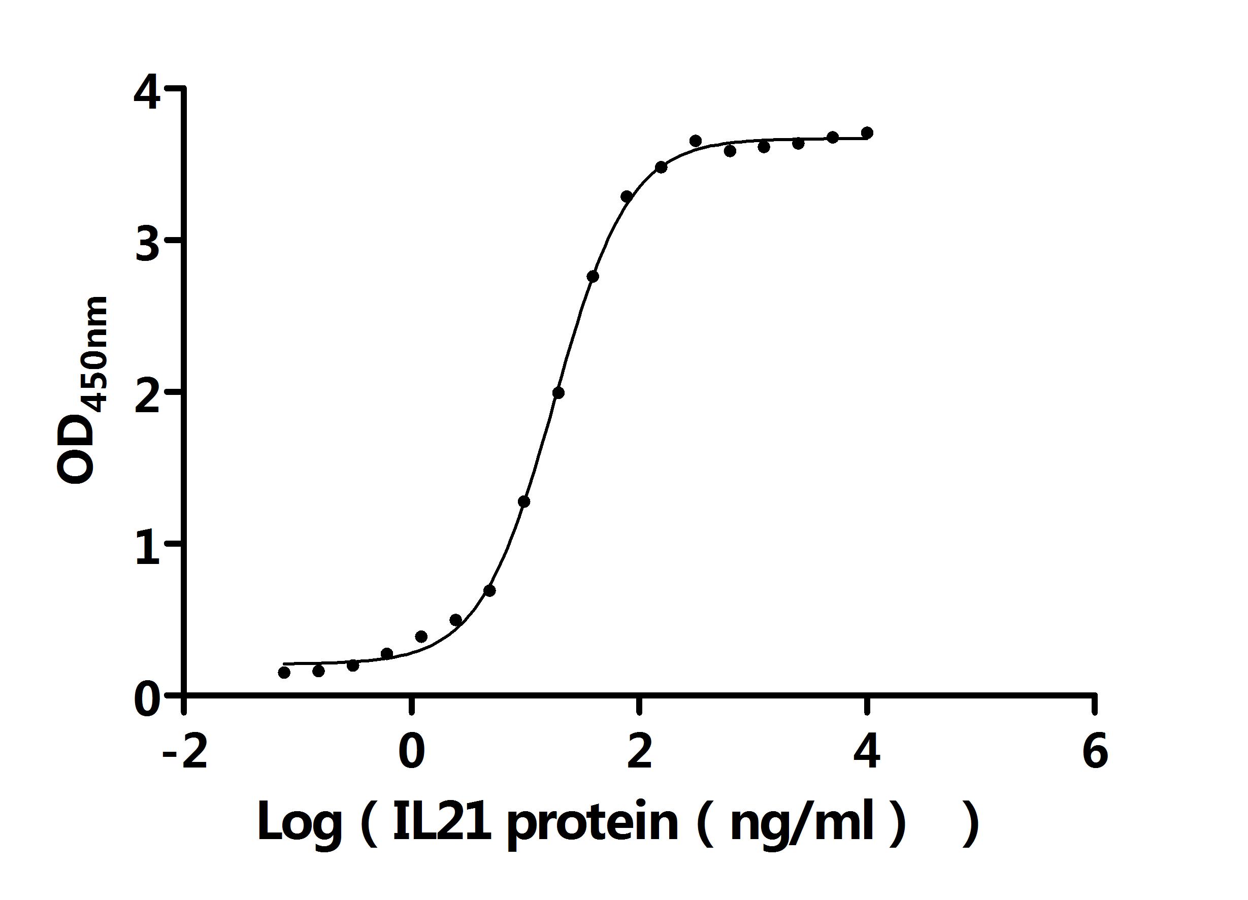 Measured by its binding ability in a functional ELISA. Immobilized Human IL21R at 2 μg/ml can bind Human IL21 (CSB-MP872537HU). The EC50 is 16.65-19.49 ng/mL. Biological Activity Assay -