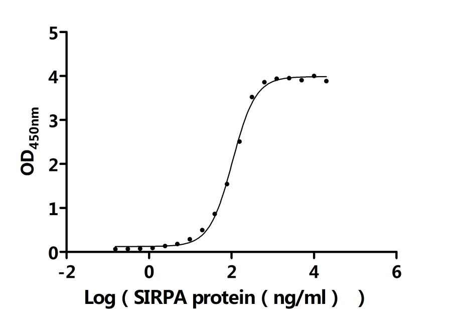①Measured by its binding ability in a functional ELISA. Immobilized Human CD47 (CSB-MP004940HUd7) at 2 μg/ml can bind Human SIRPA protein. The EC50 is 98.73-112.7 ng/mL. Biological Activity Assay -