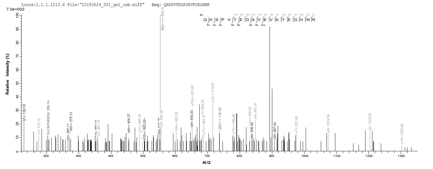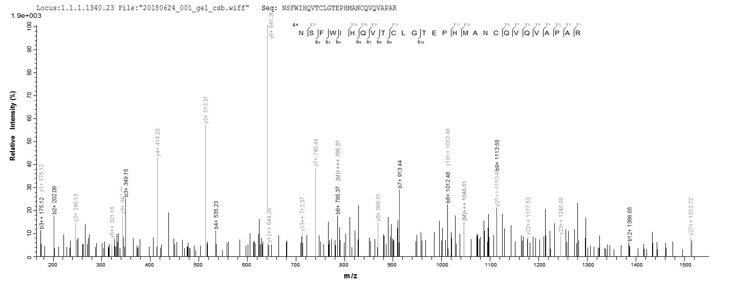 Based on the SEQUEST from database of E.coli host and target protein, the LC-MS/MS Analysis result of CSB-EP846643HU could indicate that this peptide derived from E.coli-expressed Homo sapiens (Human) LOXL4.