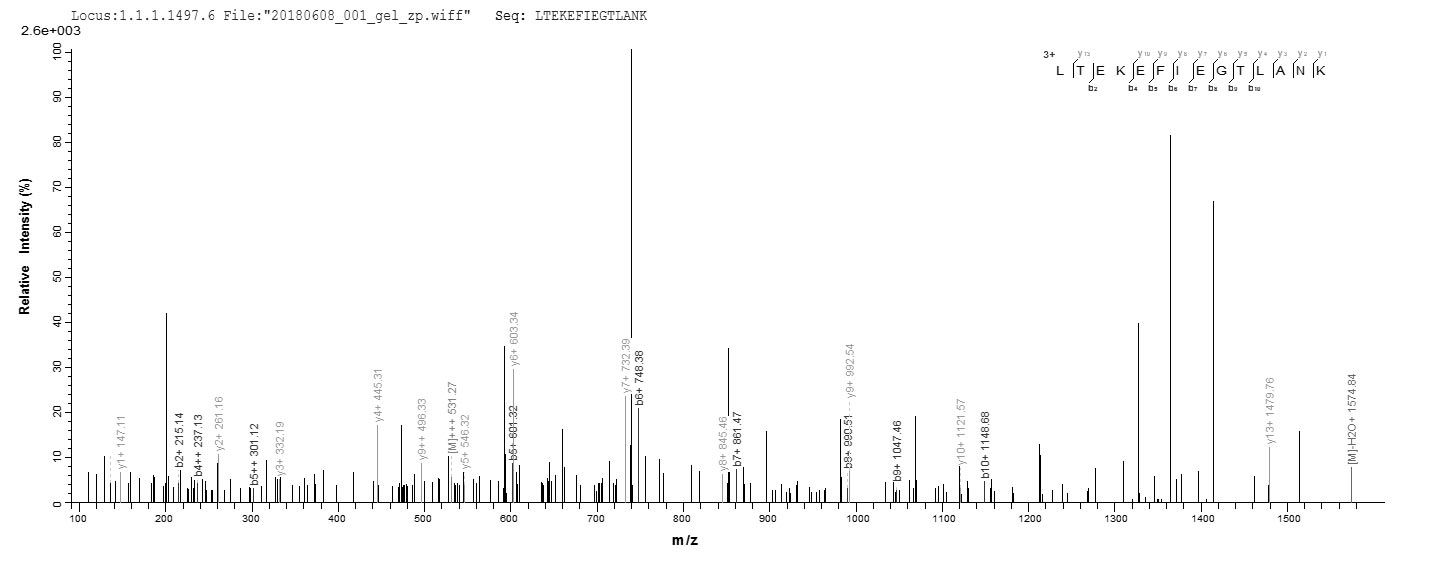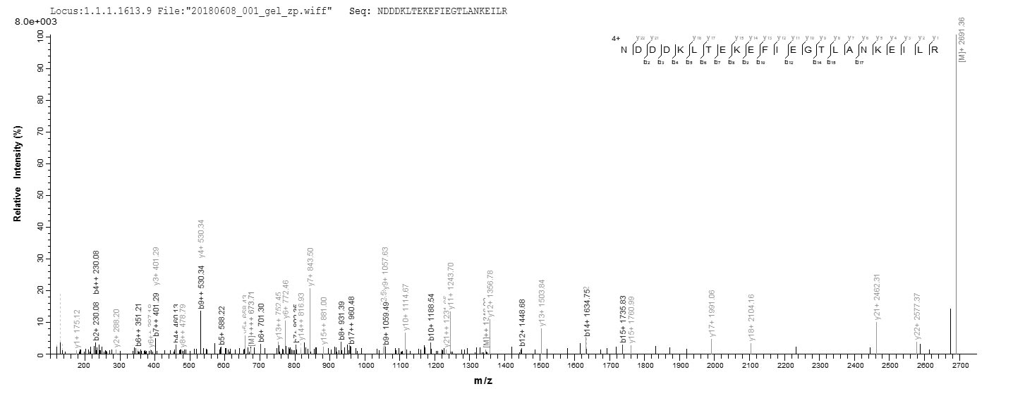 Based on the SEQUEST from database of E.coli host and target protein, the LC-MS/MS Analysis result of CSB-EP019519HU could indicate that this peptide derived from E.coli-expressed Homo sapiens (Human) RCVRN.