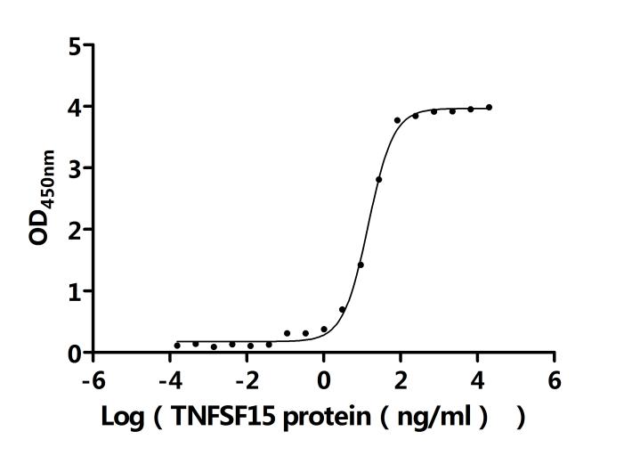 Measured by its binding ability in a functional ELISA.Immobilized Human TNFRSF25 at 2 μg/ml can bind Human TNFSF15(CSB-MP023992HU1c9). The EC50 is 13.26-15.80 ng/mL. Biological Activity Assay