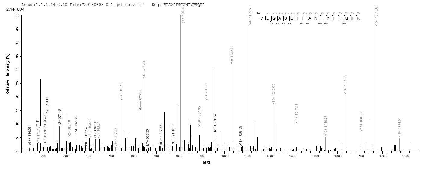 Based on the SEQUEST from database of E.coli host and target protein, the LC-MS/MS Analysis result of CSB-EP023577HWY could indicate that this peptide derived from E.coli-expressed Human herpesvirus 1 (strain 17) (HHV-1) (Human herpes simplex virus 1) TK.
