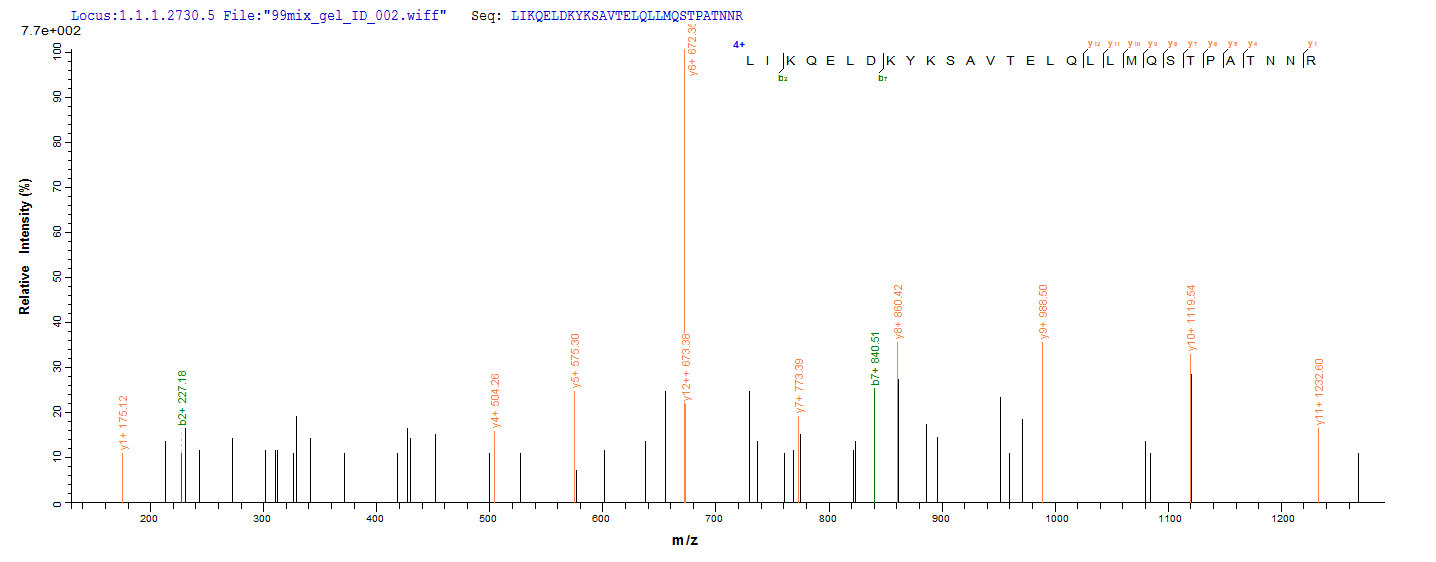 Based on the SEQUEST from database of E.coli host and target protein, the LC-MS/MS Analysis result of CSB-EP319265HPWb1 could indicate that this peptide derived from E.coli-expressed Human respiratory syncytial virus A (strain RSS-2) F.