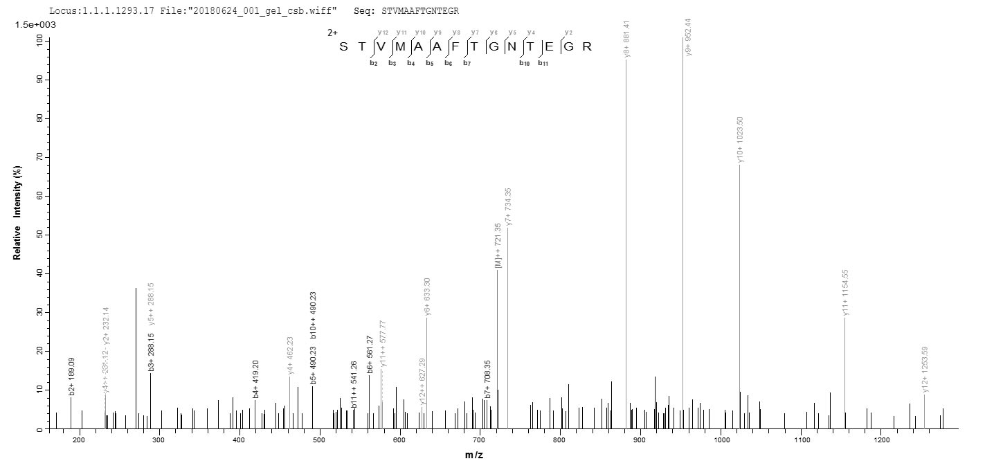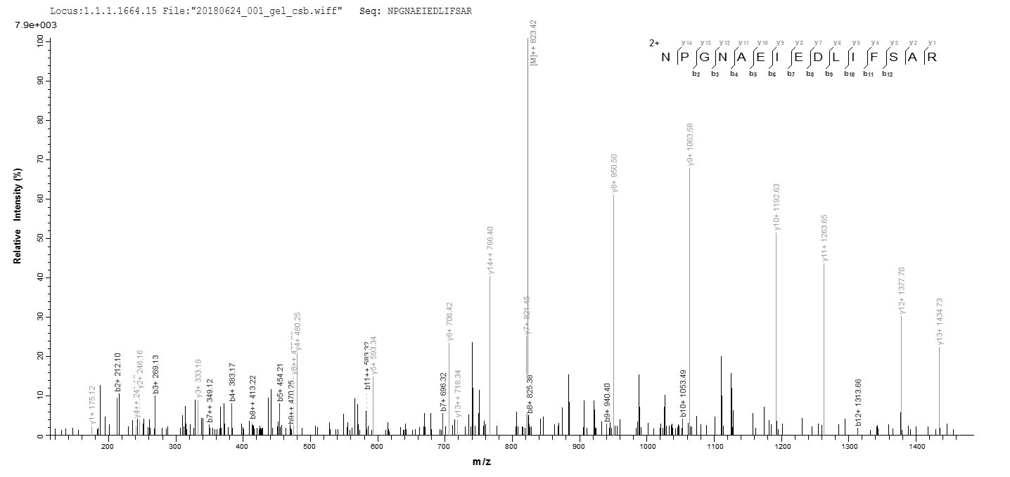 Based on the SEQUEST from database of E.coli host and target protein, the LC-MS/MS Analysis result of CSB-EP529597IMP could indicate that this peptide derived from E.coli-expressed Influenza A virus (strain A/Kitakyushu/159/1993 H3N2) NP.