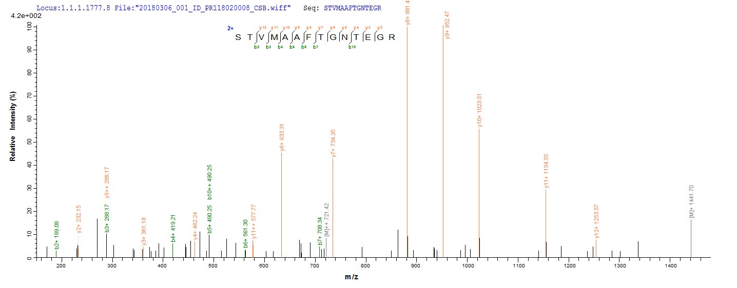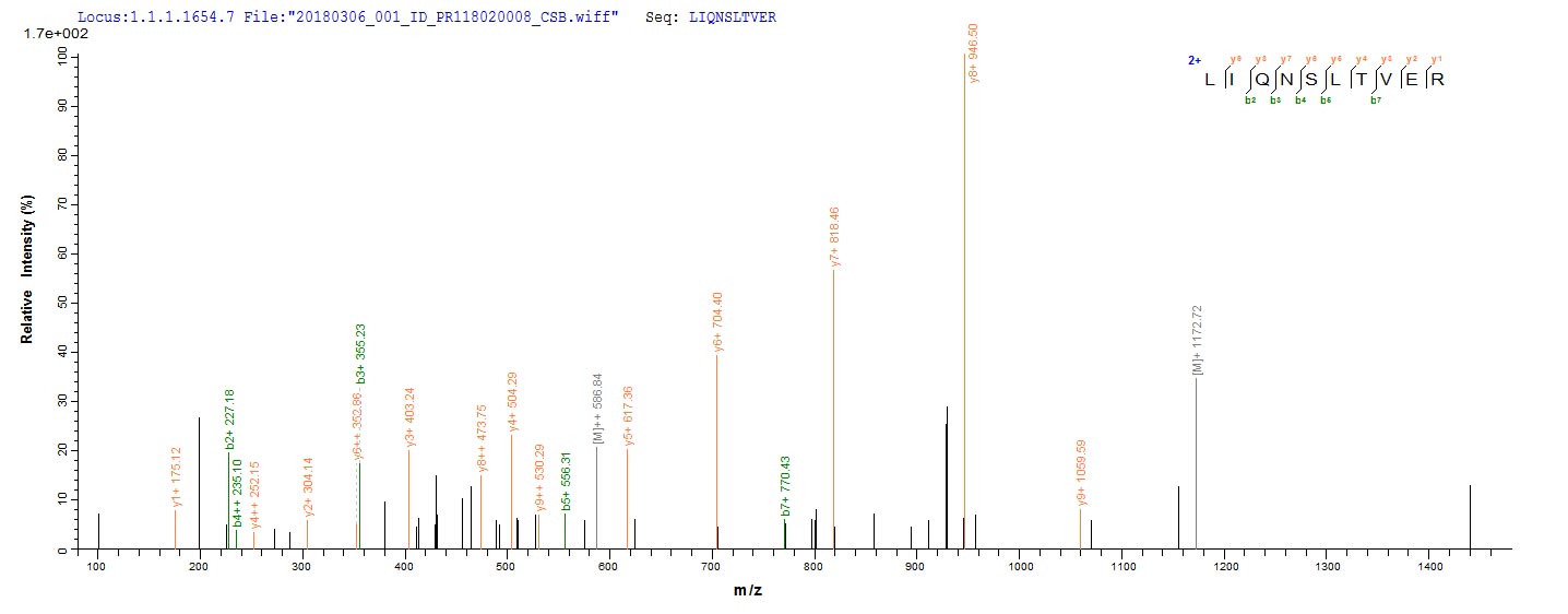 Based on the SEQUEST from database of E.coli host and target protein, the LC-MS/MS Analysis result of CSB-EP302450IGF could indicate that this peptide derived from E.coli-expressed Influenza A virus (strain A/Shanghai/16/1989 H3N2) NP.