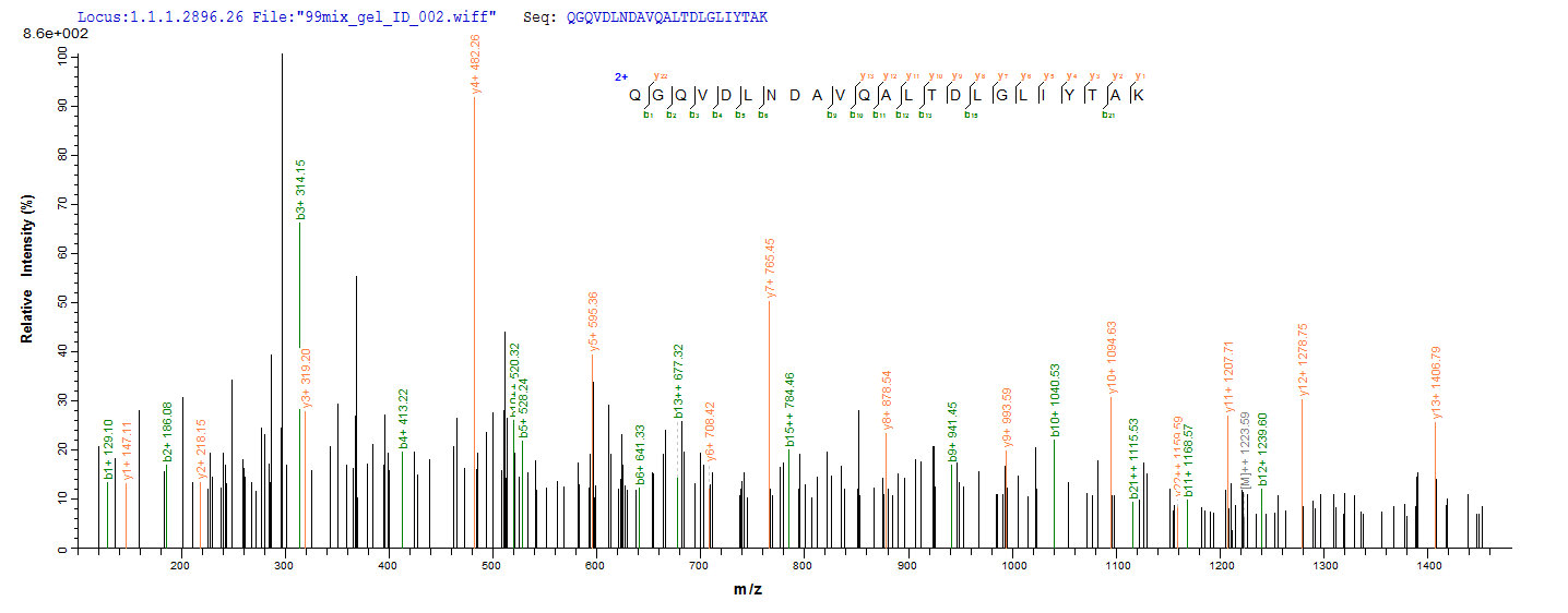 Based on the SEQUEST from database of Yeast host and target protein, the LC-MS/MS Analysis result of CSB-YP318401LNP could indicate that this peptide derived from Yeast-expressed strain Mouse/Sierra Leone/Josiah/1976)(LASV) N.