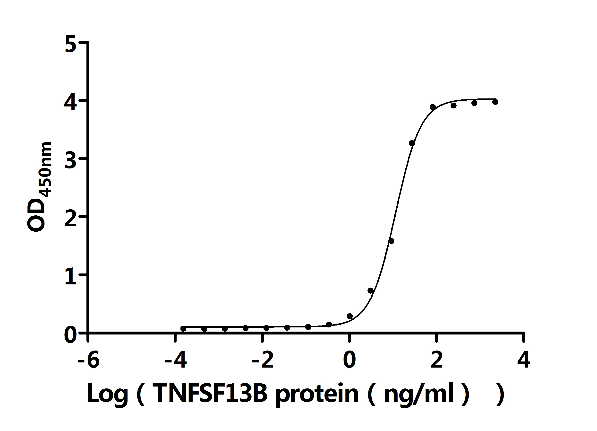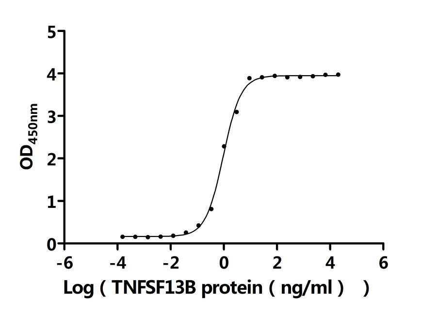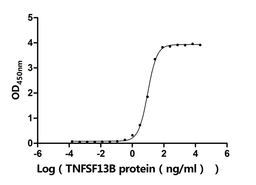 Measured by its binding ability in a functional ELISA. Immobilized Macaca fascicularis TNFRSF13B at 2 μg/ml can bind Human TNFSF13B protein (CSB-MP897523HU1). The EC50 is 10.67-12.46 ng/mL. Biological Activity Assay -