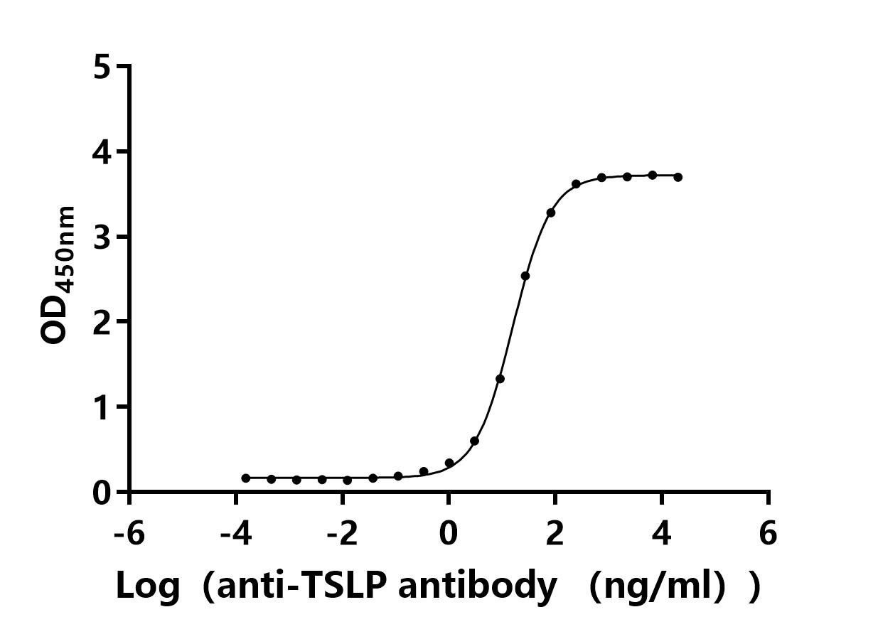 ②Measured by its binding ability in a functional ELISA.Immobilized Macaca fascicularis TSLP at 2 μg/ml on streptavidin coated plates can bind Anti-TSLP recombinant antibody(CSB-RA025141MA2HU). The EC50 is 11.71-21.61 ng/mL. Biological Activity Assay