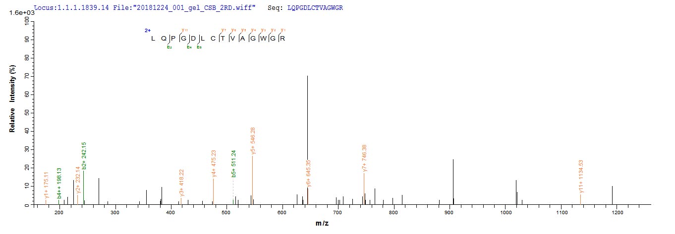 Based on the SEQUEST from database of E.coli host and target protein, the LC-MS/MS Analysis result of CSB-EP006190MO could indicate that this peptide derived from E.coli-expressed Mus musculus (Mouse) Ctsg.