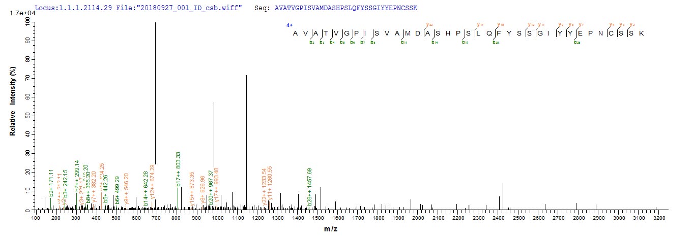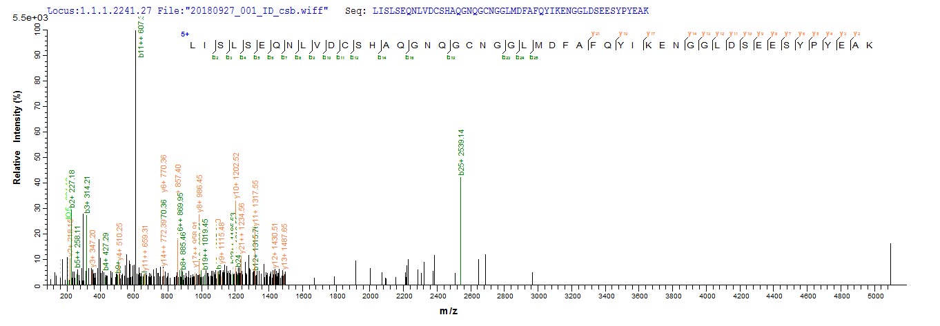 Based on the SEQUEST from database of E.coli host and target protein, the LC-MS/MS Analysis result of CSB-EP006193MO could indicate that this peptide derived from E.coli-expressed Mus musculus (Mouse) Ctsl.