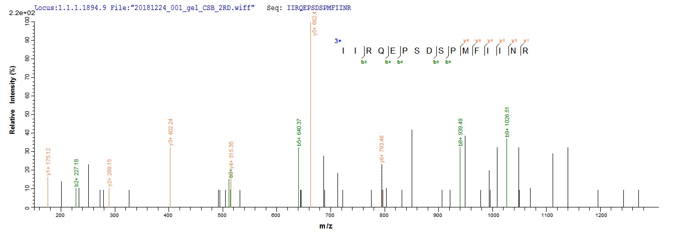 Based on the SEQUEST from database of E.coli host and target protein, the LC-MS/MS Analysis result of CSB-EP723414MO could indicate that this peptide derived from E.coli-expressed Mus musculus (Mouse) Dsg1a.