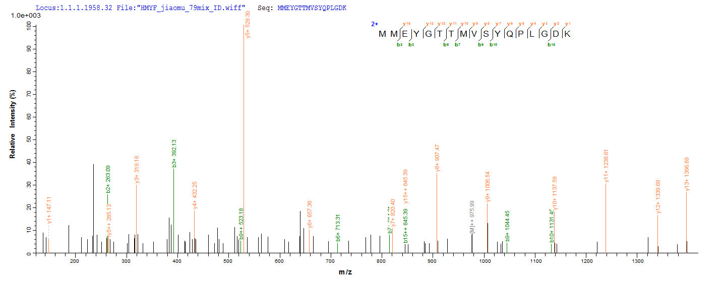 Based on the SEQUEST from database of E.coli host and target protein, the LC-MS/MS Analysis result of CSB-EP009160MO could indicate that this peptide derived from E.coli-expressed Mus musculus (Mouse) Gad2.