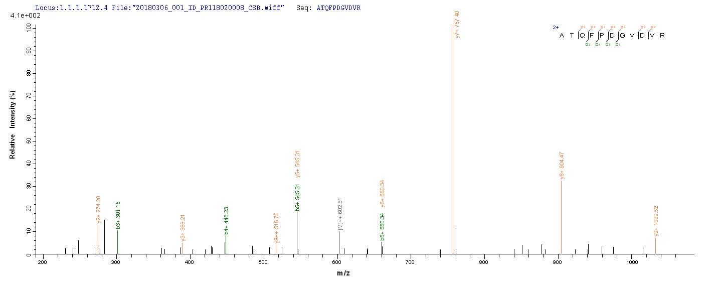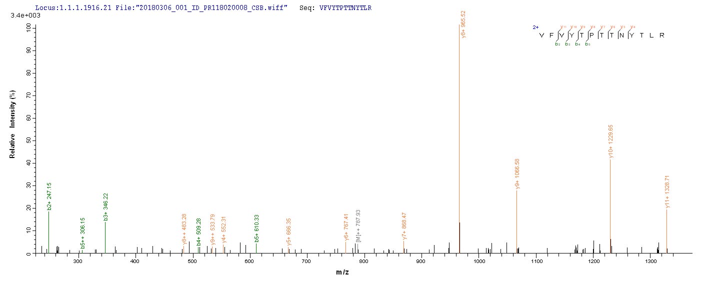 Based on the SEQUEST from database of E.coli host and target protein, the LC-MS/MS Analysis result of CSB-EP840854MO could indicate that this peptide derived from E.coli-expressed Mus musculus (Mouse) Pla2g15.