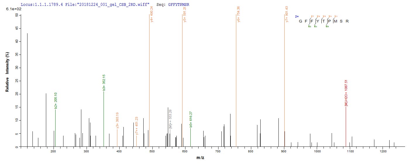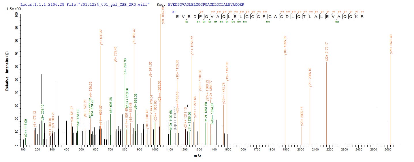 Based on the SEQUEST from database of E.coli host and target protein, the LC-MS/MS Analysis result of CSB-EP360644MO could indicate that this peptide derived from E.coli-expressed Mus musculus (Mouse) Ins2.