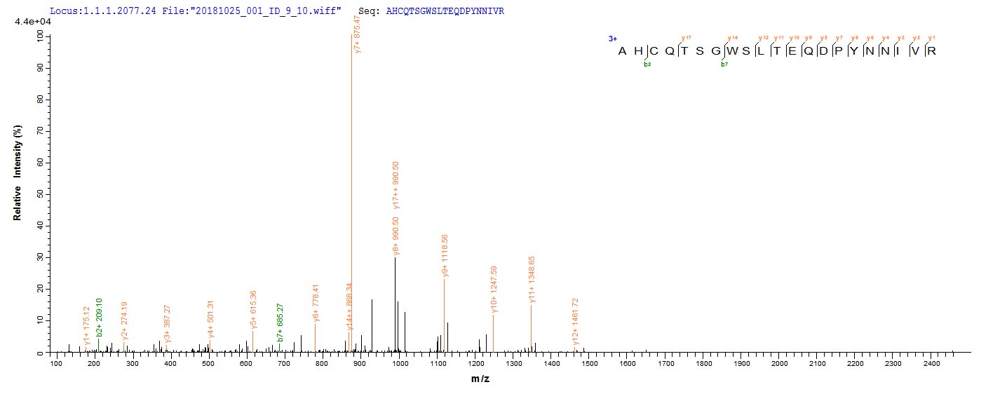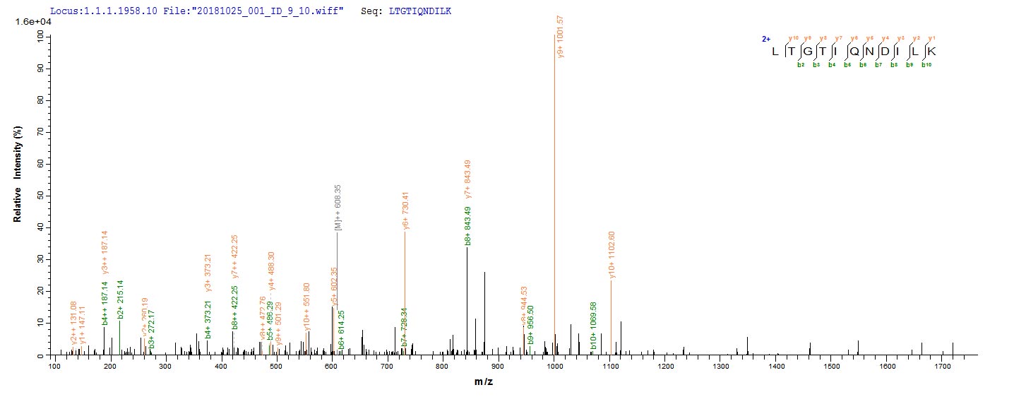 Based on the SEQUEST from database of E.coli host and target protein, the LC-MS/MS Analysis result of CSB-EP015243MO could indicate that this peptide derived from E.coli-expressed Mus musculus (Mouse) Mut.