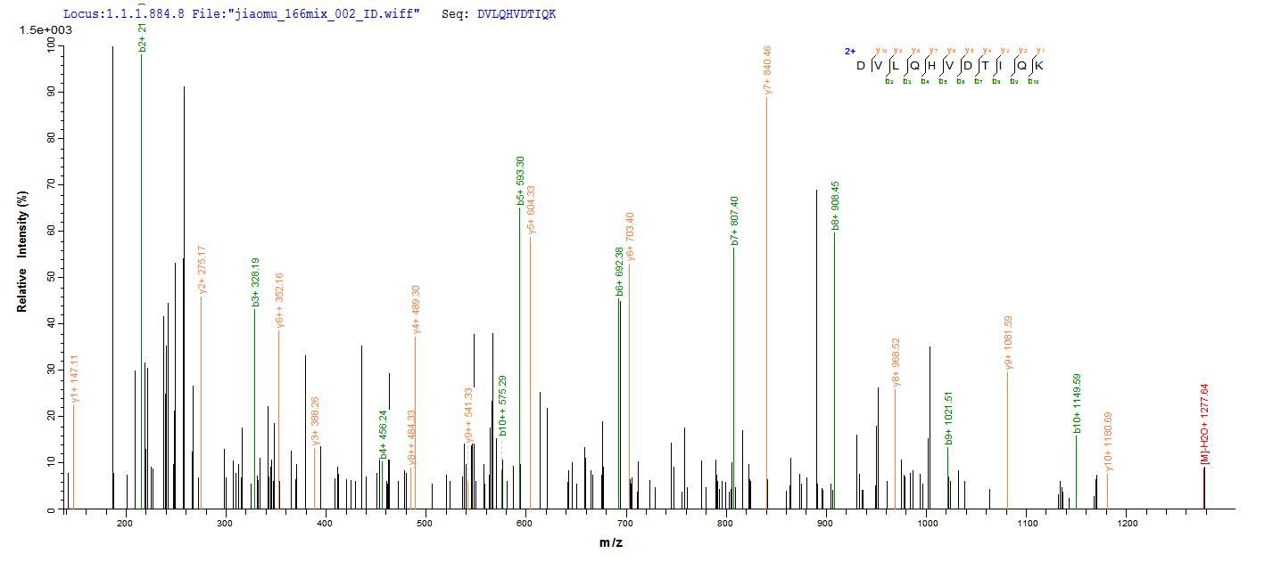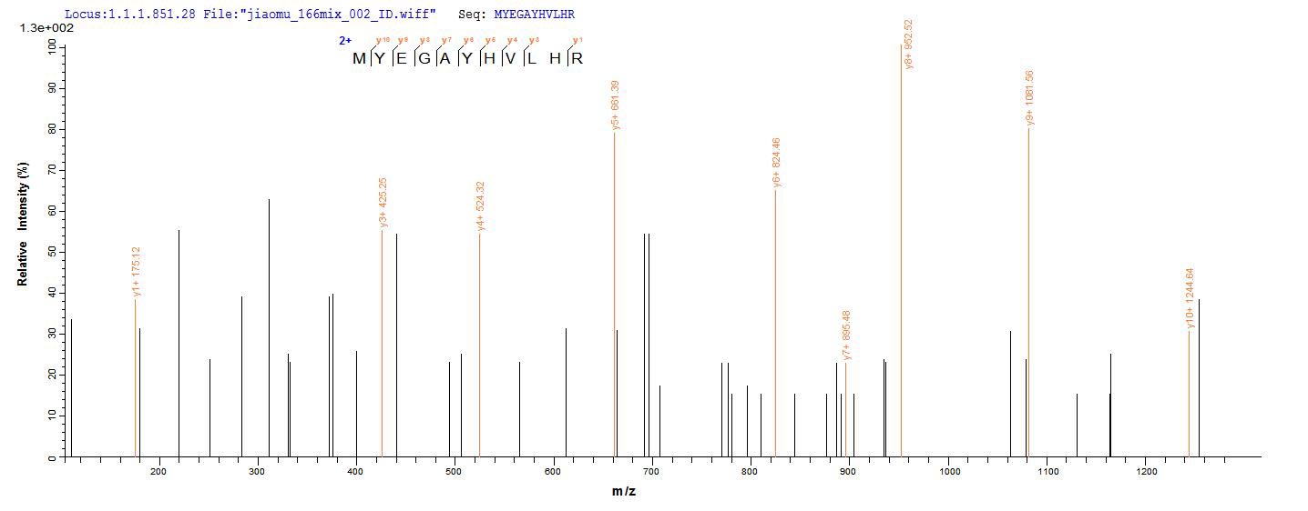 Based on the SEQUEST from database of E.coli host and target protein, the LC-MS/MS Analysis result of CSB-EP013787MOa2 could indicate that this peptide derived from E.coli-expressed Mus musculus (Mouse) Mgll.