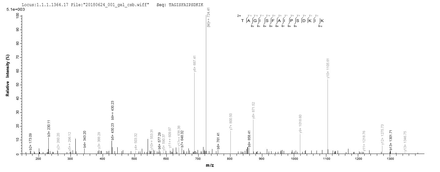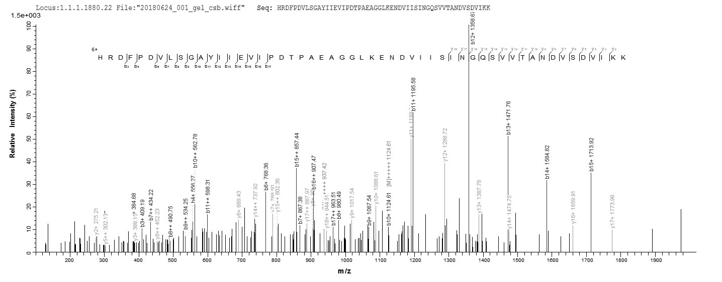 Based on the SEQUEST from database of E.coli host and target protein, the LC-MS/MS Analysis result of CSB-EP879501MO1 could indicate that this peptide derived from E.coli-expressed Mus musculus (Mouse) Htra1.