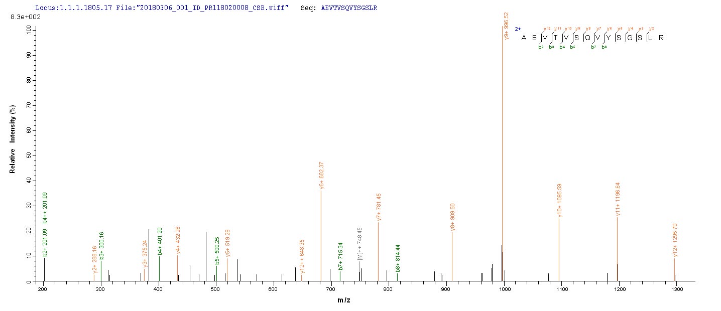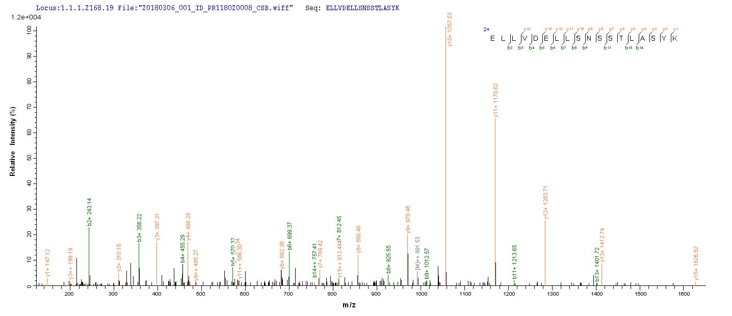 Based on the SEQUEST from database of Baculovirus host and target protein, the LC-MS/MS Analysis result of CSB-BP880561MO could indicate that this peptide derived from Baculovirus-expressed Mus musculus (Mouse) Tmprss6.