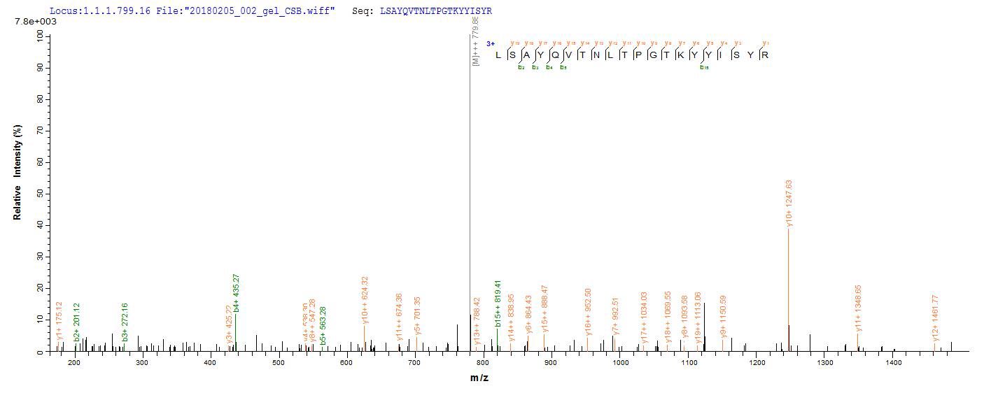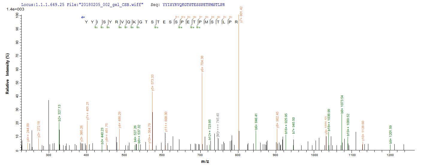 Based on the SEQUEST from database of E.coli host and target protein, the LC-MS/MS Analysis result of CSB-EP025656MO could indicate that this peptide derived from E.coli-expressed Mus musculus (Mouse) Upk2.