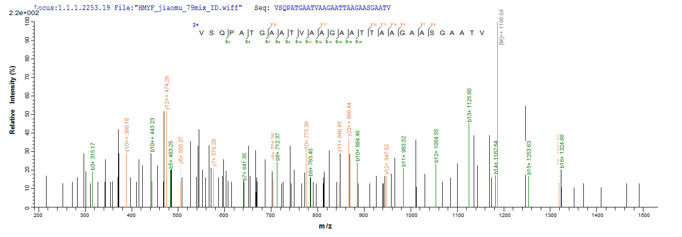 Based on the SEQUEST from database of E.coli host and target protein, the LC-MS/MS Analysis result of CSB-EP671435EUQ could indicate that this peptide derived from E.coli-expressed Phleum pratense (Common timothy) Phl p 5b.