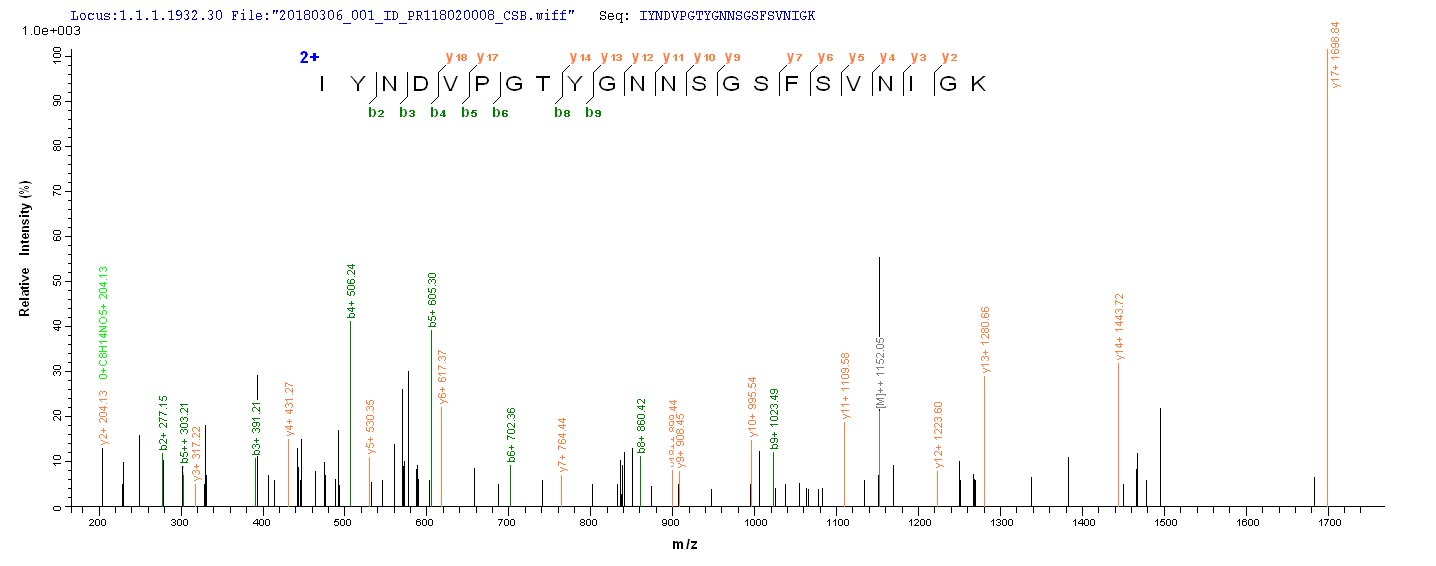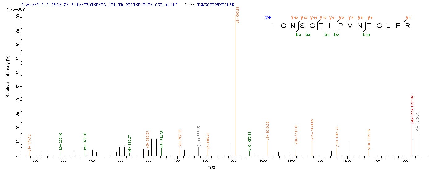 Based on the SEQUEST from database of E.coli host and target protein, the LC-MS/MS Analysis result of CSB-EP313124EZX could indicate that this peptide derived from E.coli-expressed Pseudomonas aeruginosa (strain ATCC 15692 / DSM 22644 / CIP 104116 / JCM 14847 / LMG 12228 / 1C / PRS 101 / PAO1) lecA.