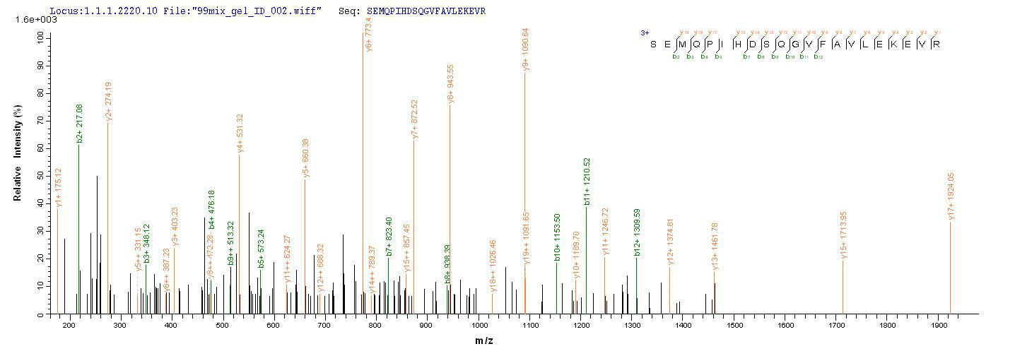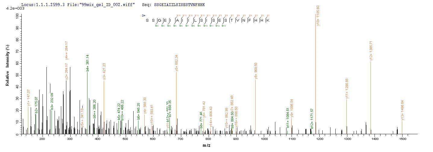 Based on the SEQUEST from database of E.coli host and target protein, the LC-MS/MS Analysis result of CSB-EP346531EZX could indicate that this peptide derived from E.coli-expressed Pseudomonas aeruginosa (strain ATCC 15692 / DSM 22644 / CIP 104116 / JCM 14847 / LMG 12228 / 1C / PRS 101 / PAO1) rhlR.