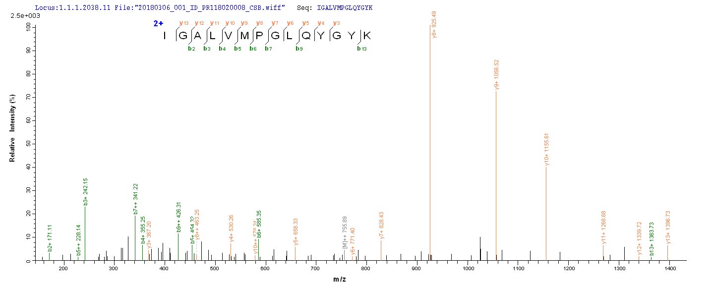 Based on the SEQUEST from database of E.coli host and target protein, the LC-MS/MS Analysis result of CSB-EP028075FFZ could indicate that this peptide derived from E.coli-expressed Pseudomonas putida (Arthrobacter siderocapsulatus) crnA.
