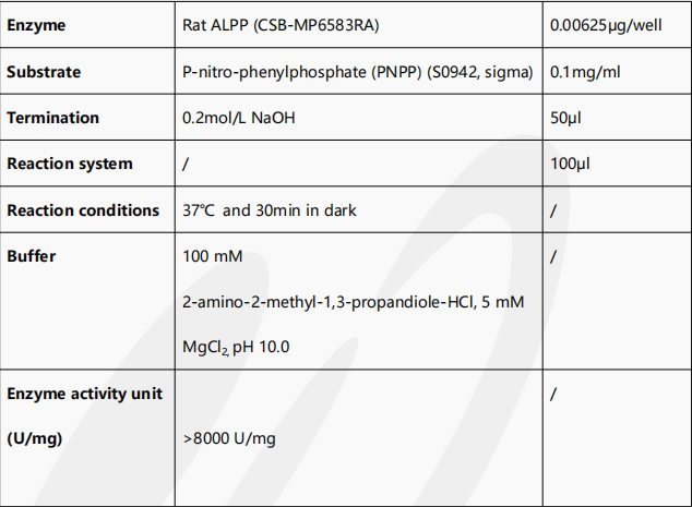 Unit Definition:One unit is defined as the amount of enzyme required to cleave 1 nmol p-nitro-phenylphosphate(pNPP), in 1 minute at 37°C, pH10.0.The specific activity is >8000 pmol/min/ug. Biological Activity Assay
